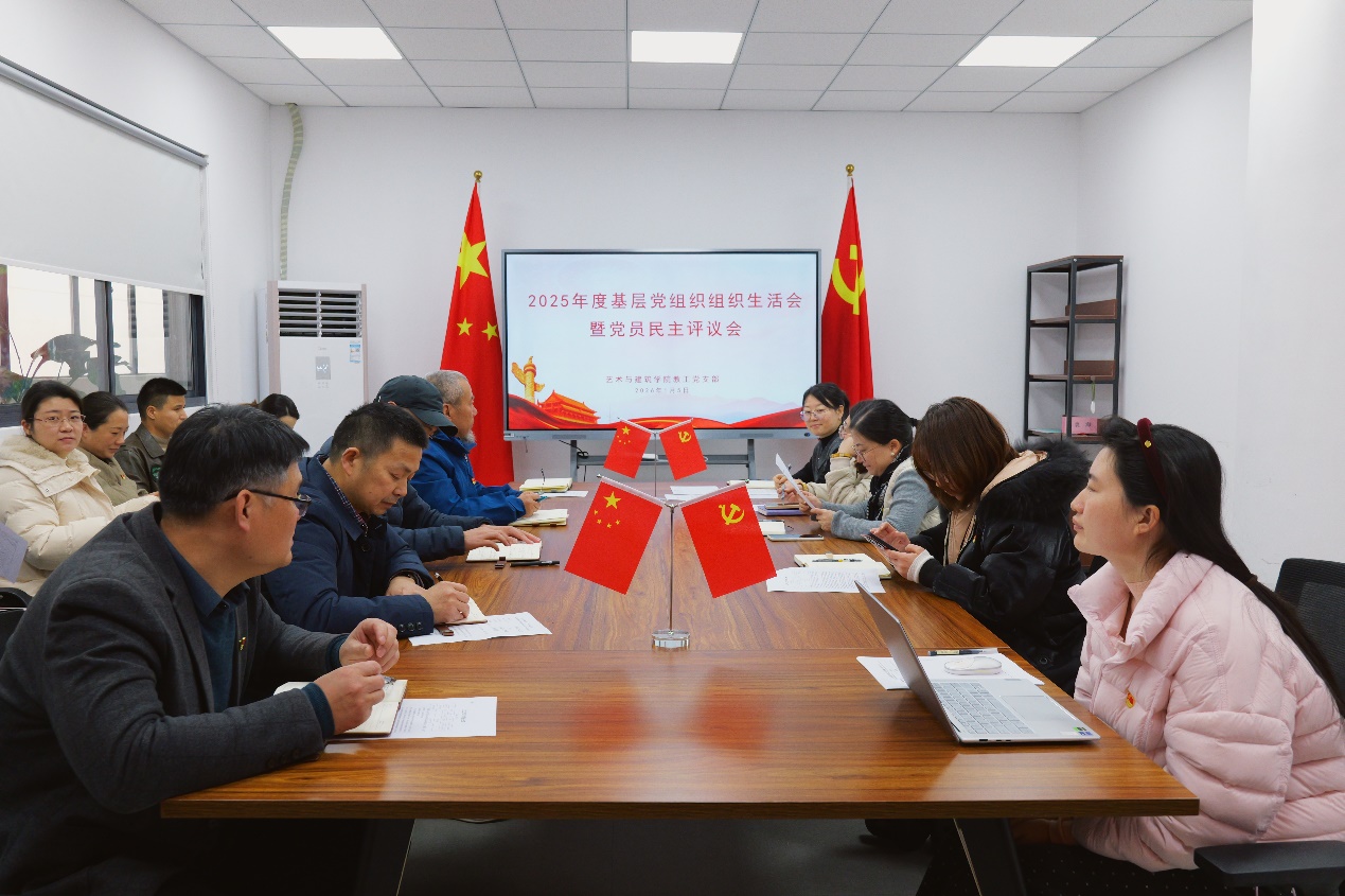 为深入学习贯彻党的二十大及二十届四中全会精神,巩固拓展主题教育成果,进一步强化党性锤炼、严明纪律规矩、弘扬优良作风,2026年1月5日下午,艺术与建筑学院教工党支部在学院会议室召开“恪守初心强作风,担当使命促发展”2025年度基层党组织组织生活会暨党员民主评议大会。会议由教工党支部书记付玲主持,全体教工党员参会。